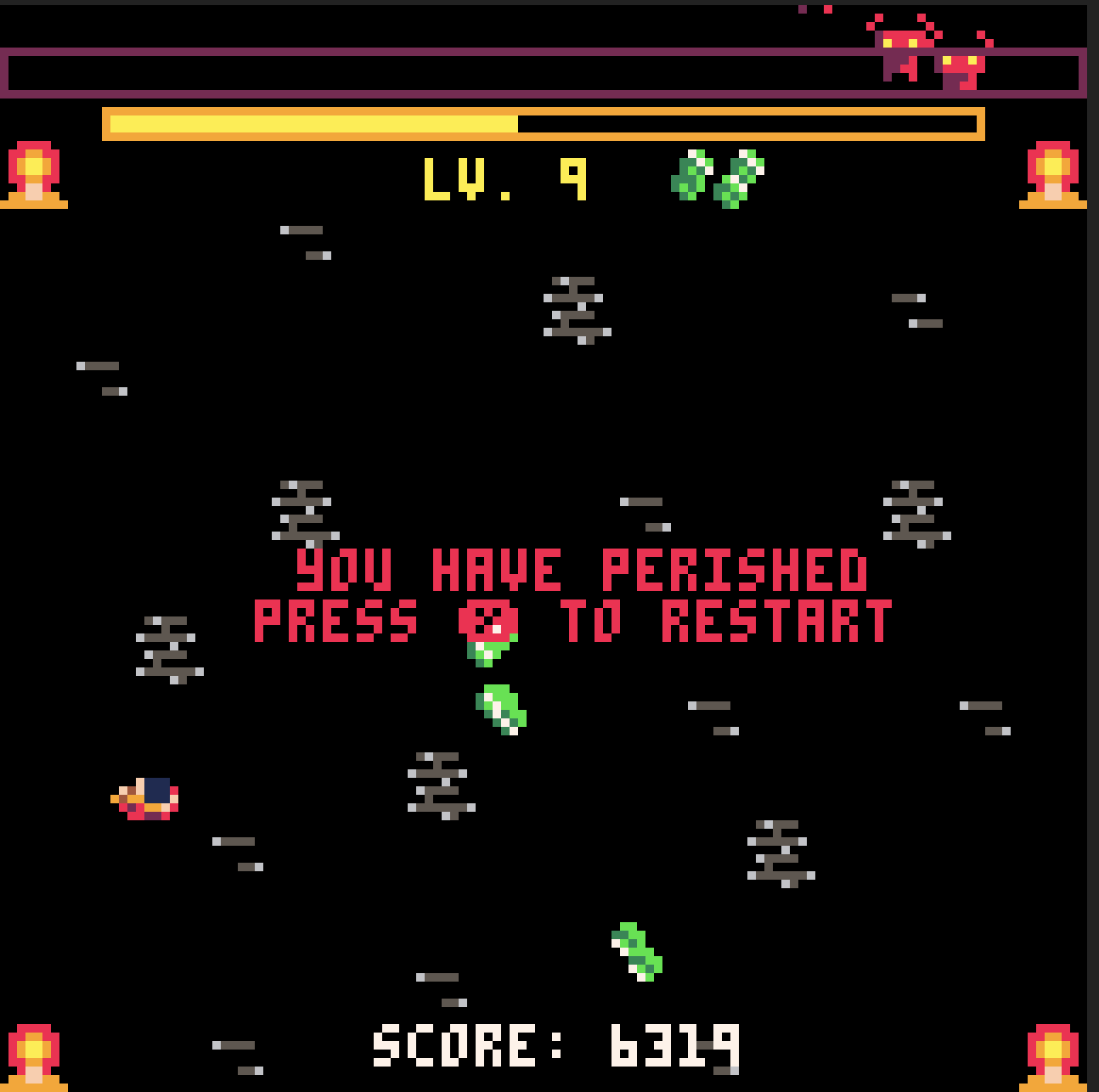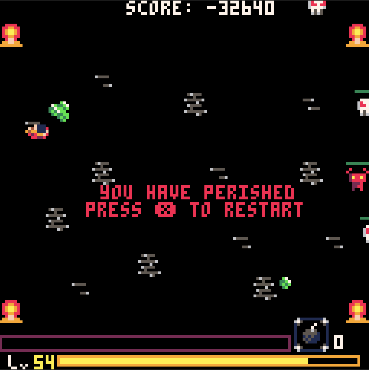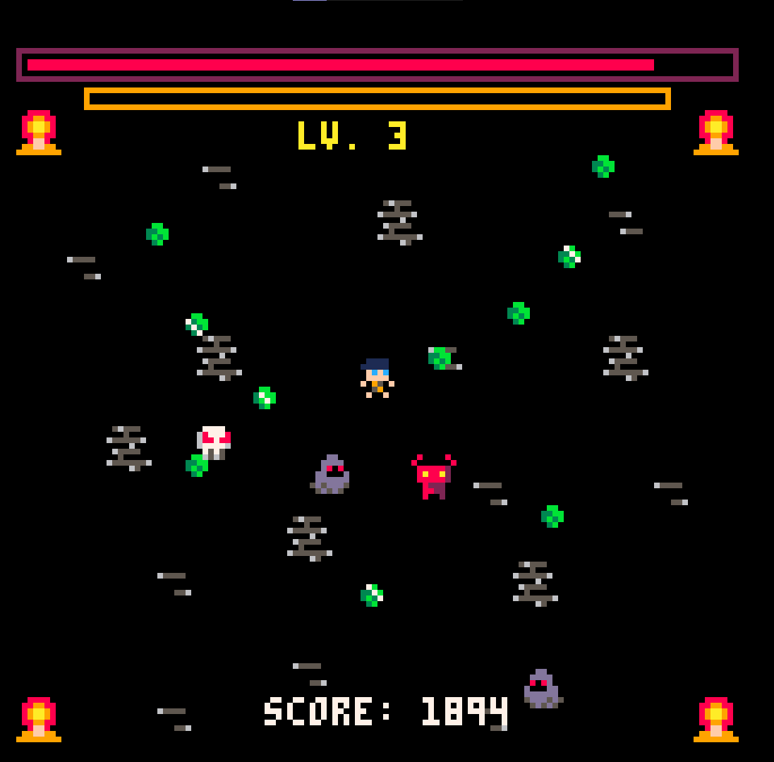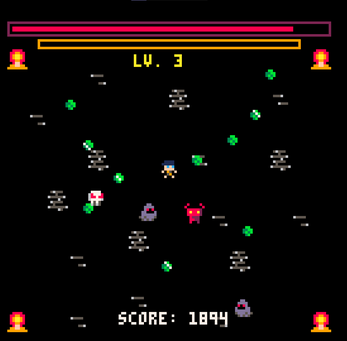 I did much better that round haha! I felt like I got to a certain point and the gameplay got too repetitive, but dude, the bombs and health add a lot to the game! I think you could keep adding to this and just see where it goes if you want to turn it into a full lil arcade game. Adding random weapon drops, more enemy variety, bosses, you could turn this into a fun mini Arcade style Pico 8 Vampire Survivors. Once again, well done, I enjoyed the updates haha!